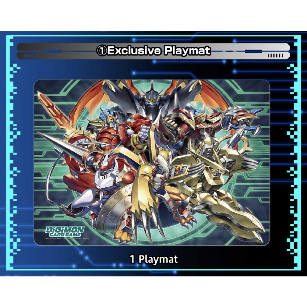 - Oficiálny set s hernou podložkou, obalmi, deck boxom, memory gauge, žetónom a exkluzívnymi kartami do hry Digimon Card Game.