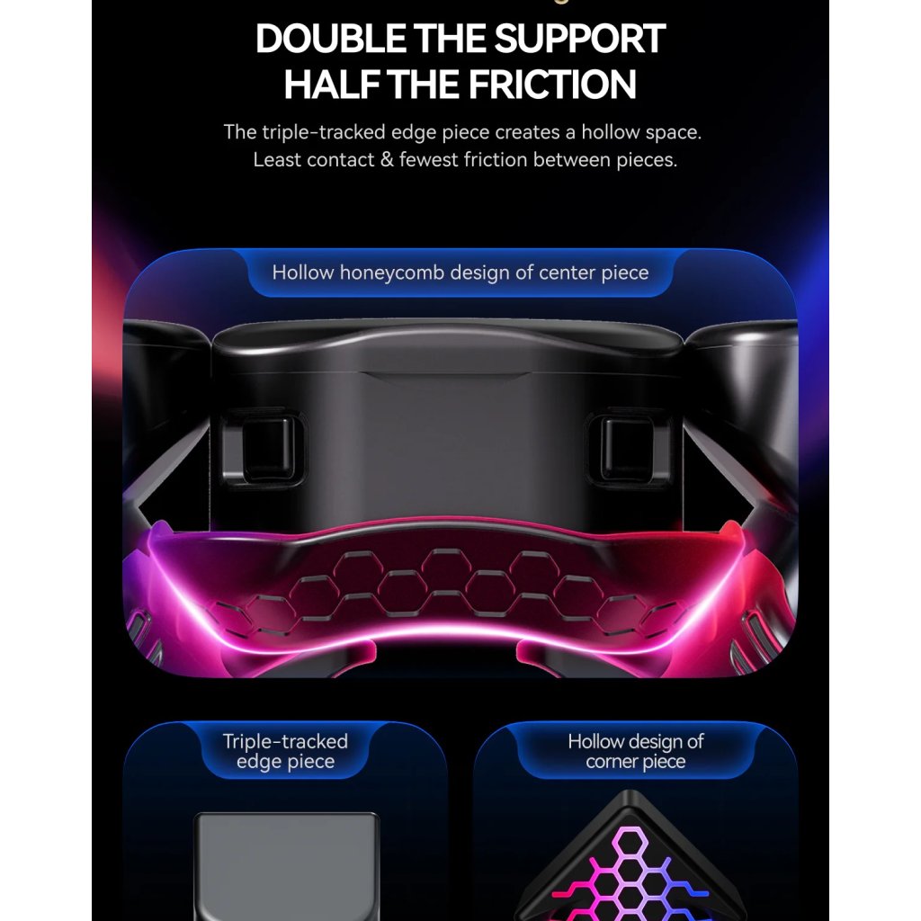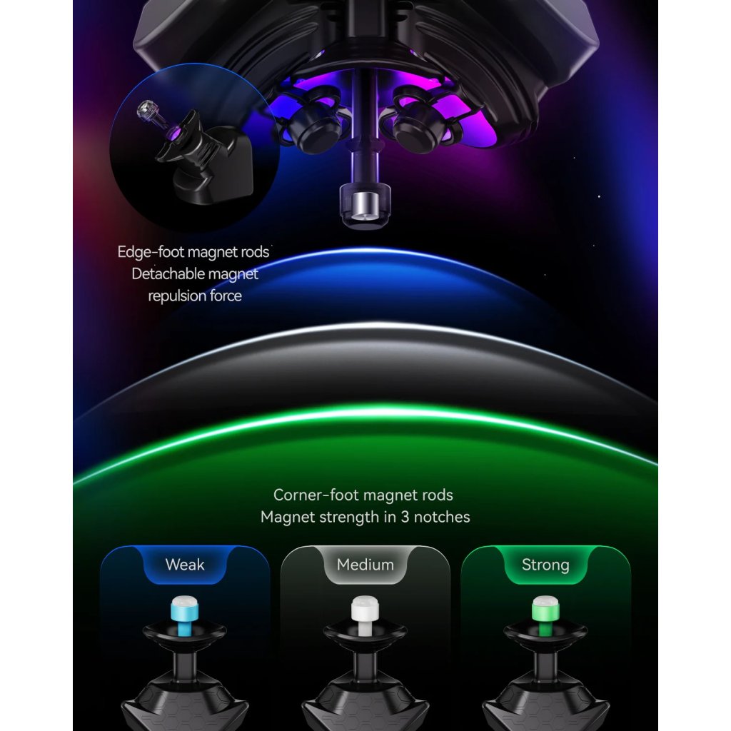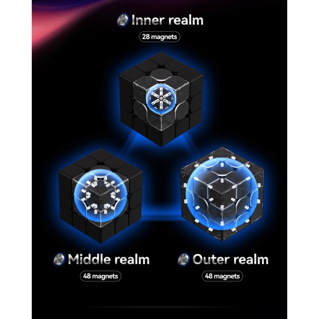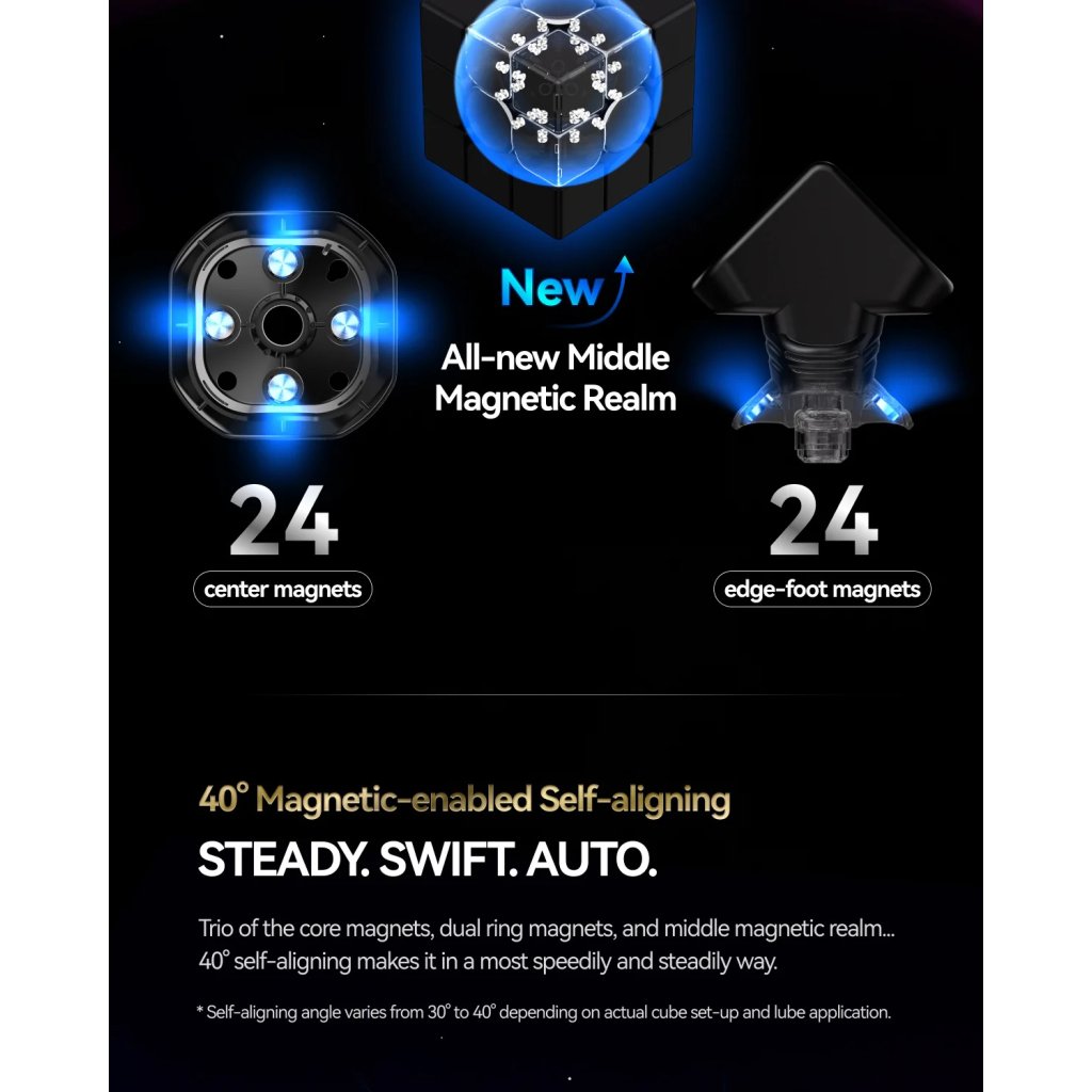 Magnet Enhanced Speedcube124 magnetov vo vnútri zaručí super výkon kocky. Self-align (automatické zarovnanie) až 40 stupňov podľa nastavenia. Magnety sú stále nastaviteľné, ale nie priamo na kocke kvôli redukcii hmotnosti. Systém MagLev znižuje ešte viac trenia, vďaka čomu je kocka rýchlejšia a tichšia. |