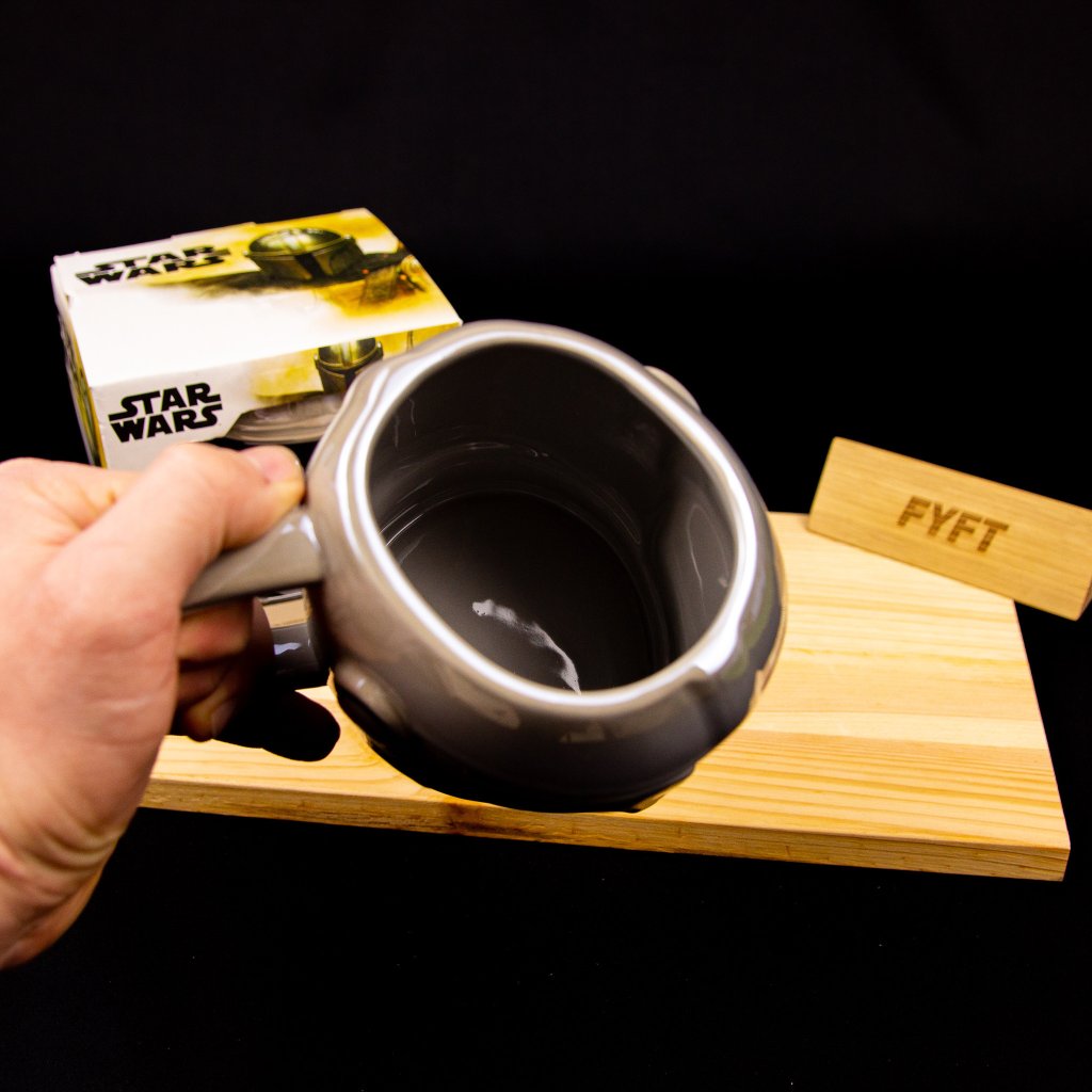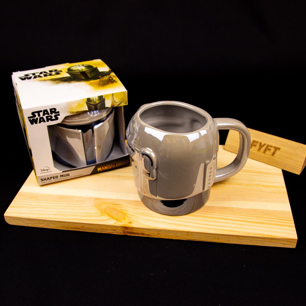 - Veľký hrnček na motívy seriálu Mandalorian av tvare helmy samotného lovca odmien.