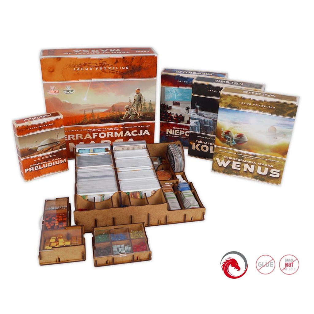 - Drevený insert navrhnutý pre základnú hru a všetky rozšírenia Mars Teraformácie. (Herná doska z Hellas a Elysium sa zmestí tiež, ale veko ľahko vyčnieva)