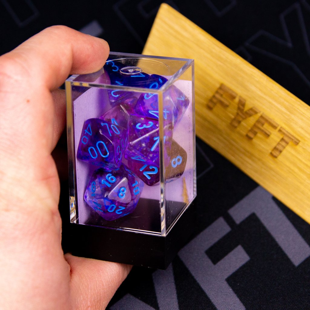 - Všetky kocky sú luminary – oproti klasickej RPG sade kociek majú svietivý efekt.